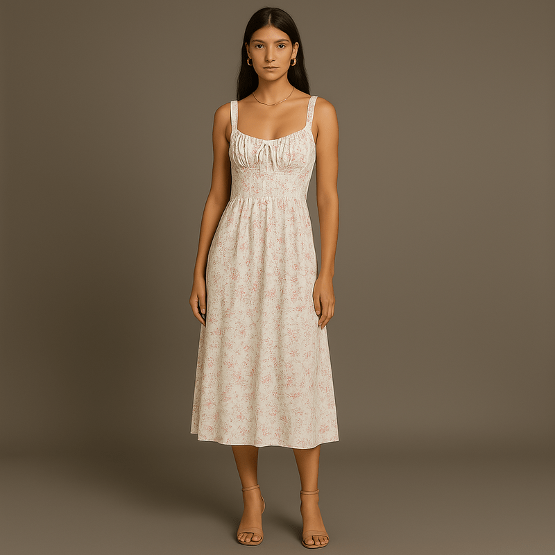 Emelie Dame Midi Kjole – Romantisk Blomstret Kjole med Justerbare Stropper og Empire Talje